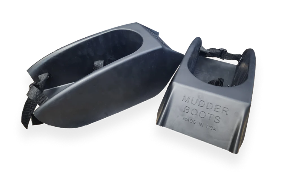 Mudder Boots overcome the two difficulties of mud travel—sinking and suction—by mimicking nature. Mudder Boots expand to a footprint of 225 square inches, providing much more surface area for balance and leverage on top of mud. These boots are made of an extremely durable rubber blend, with metal buckles that ensure a stable experience.